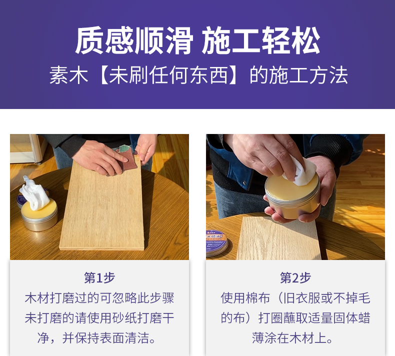 第二种:将家具表面用湿毛巾擦干净,然后通风晾干两小时;通风干燥后可直接使用切瑞西固体保养蜡擦涂。将家具处理完成后,将固体蜡打开,然后用干净的棉布或海绵沾取固体蜡;在家具或地板表面“转圈”式打蜡即可,施工一遍不要做的太厚。打蜡完成后等待3小时左右即可。